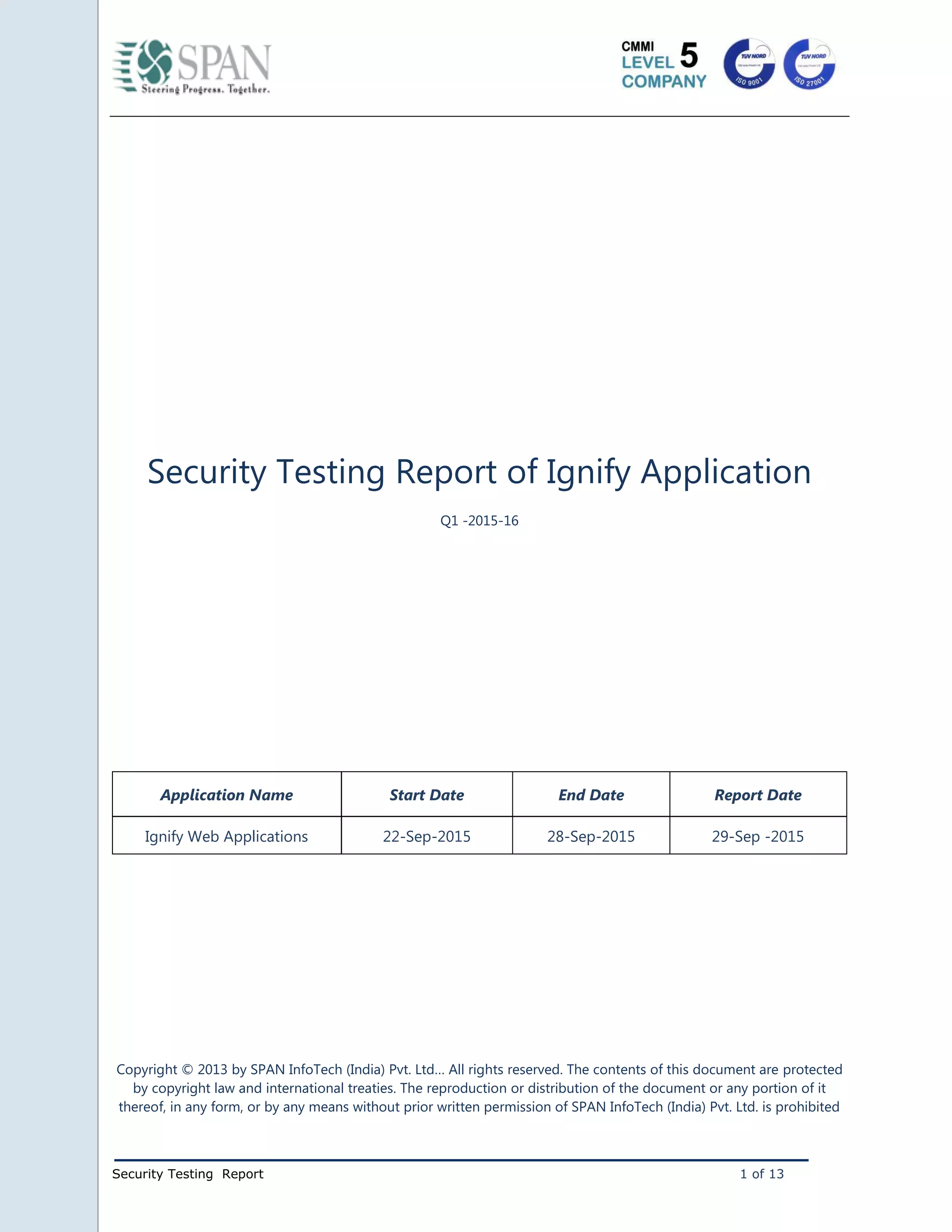 The summary provides an overview of the security testing report for the Ignify web applications. No high or medium severity vulnerabilities were found, resulting in an overall security confidence level of A (Secure). Some low severity issues were identified, such as weak password policies, but these do not significantly impact the applications or business. The report includes detailed information on vulnerabilities found, risk levels, ways to reproduce issues, and recommendations for remediation.