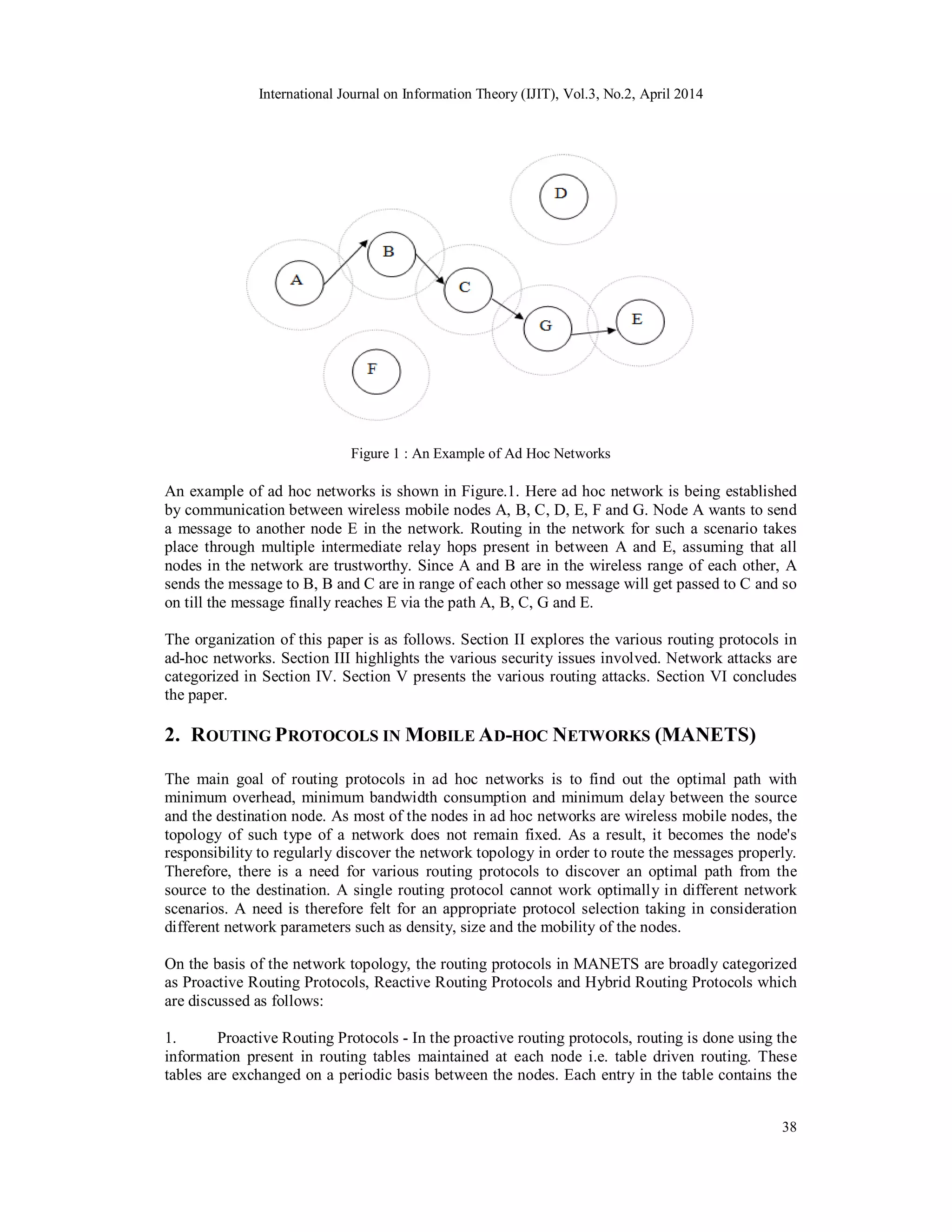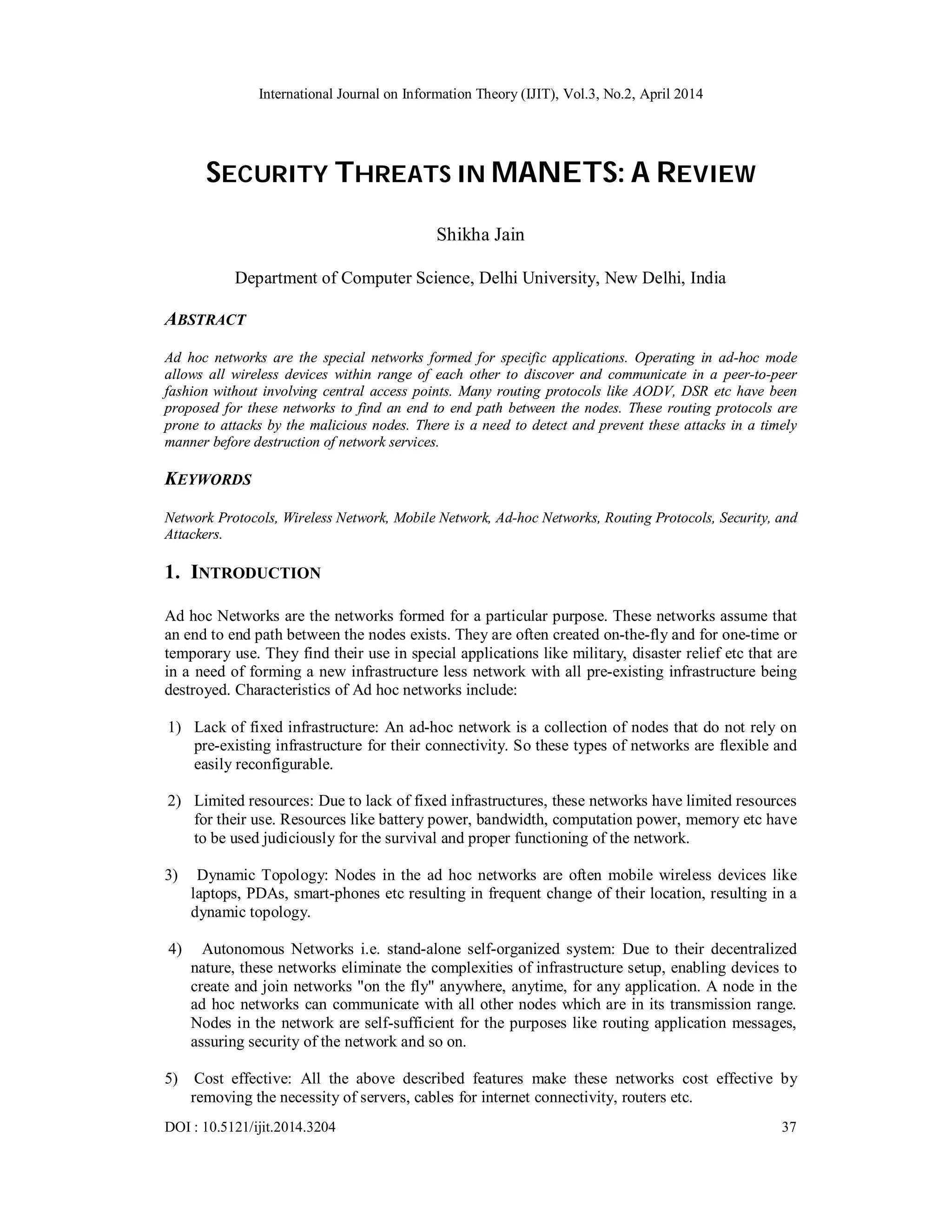 The document reviews security threats in Mobile Ad-hoc Networks (MANETs) and highlights the vulnerabilities of various routing protocols against malicious attacks. It categorizes network threats into passive and active attacks and outlines specific types of routing attacks like flooding and sleep deprivation attacks. The paper emphasizes the need for robust security measures tailored for the unique characteristics of ad hoc networks, which lack fixed infrastructure and have dynamic topologies.