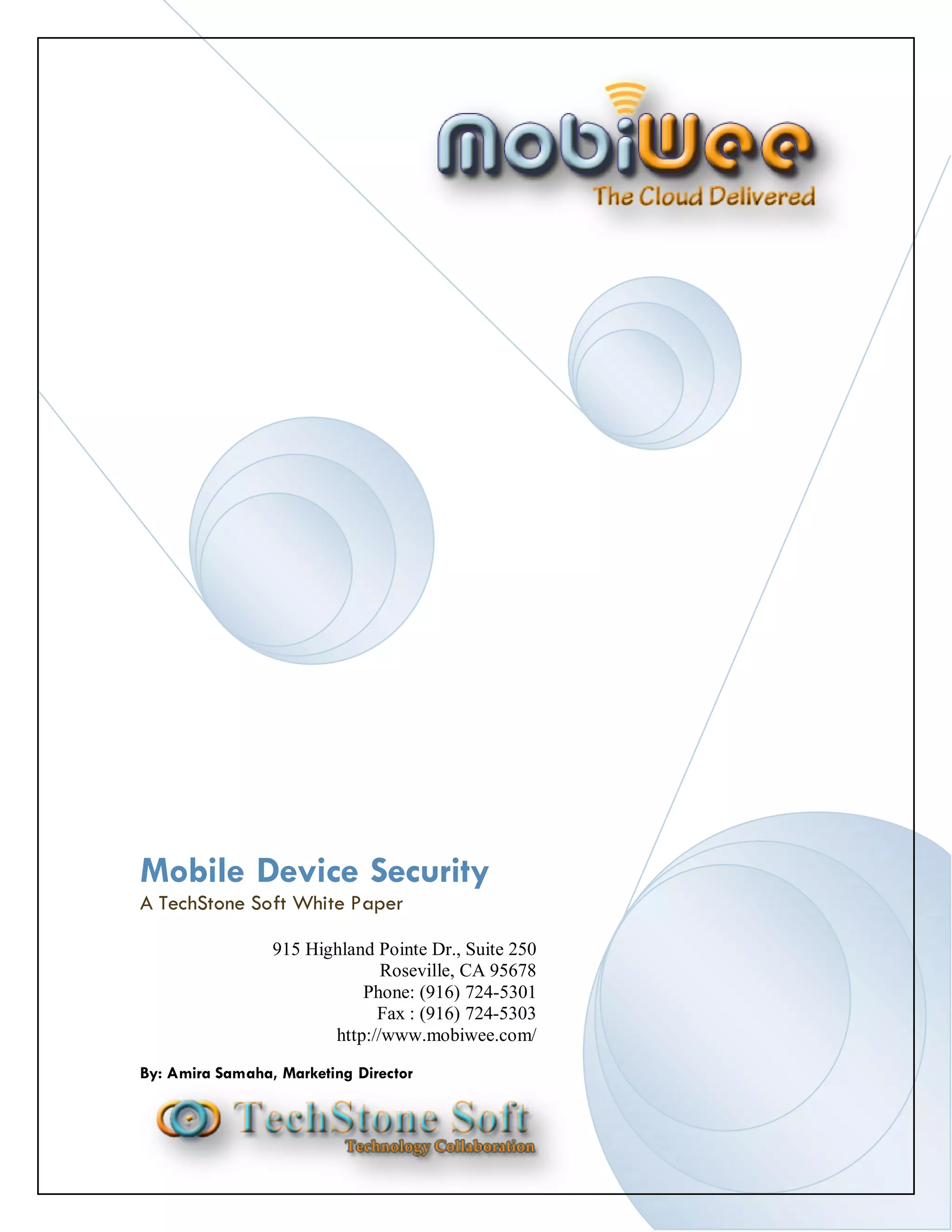 The white paper by Techstone Soft, authored by marketing director Amira Samaha, discusses mobile device security trends and presents the Mobiwee solution as a comprehensive, end-to-end security service. It addresses common pain points in mobile information management by offering features like remote lock/wipe, data encryption, and multi-factor authentication to ensure data protection even when devices are lost or stolen. Additionally, it highlights the cost-effectiveness and ease of use of the Mobiwee suite, aimed at enhancing user experience without requiring extensive technical expertise.