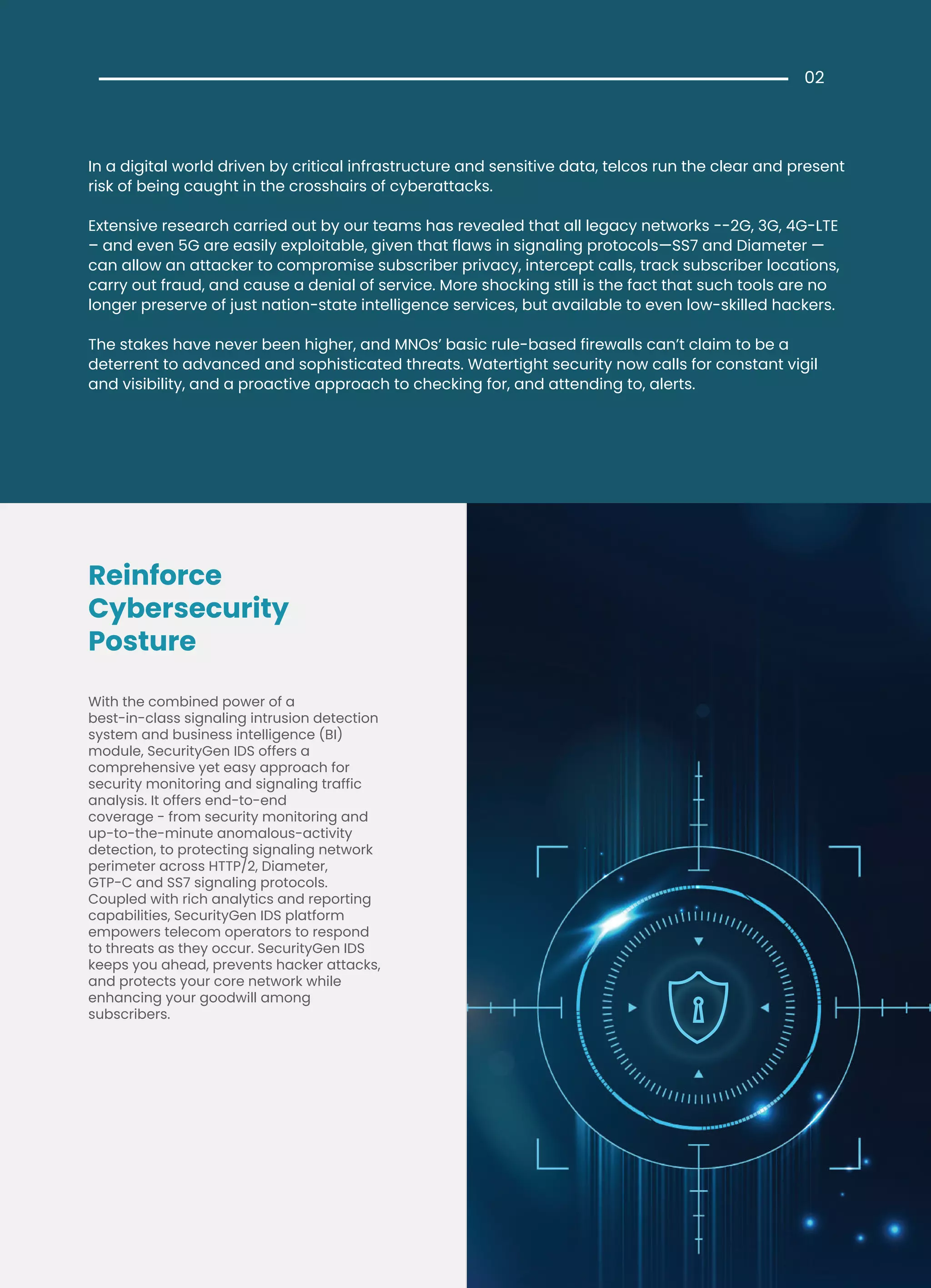 The document outlines the SecurityGen IDS platform, designed to protect telecom operators from cyber threats associated with vulnerable signaling protocols like SS7 and Diameter. It highlights features such as enhanced visibility for threat detection, advanced analytics for incident response, and integration capabilities with existing security systems. SecurityGen IDS offers comprehensive monitoring to prevent hacks, safeguard core networks, and improve overall cybersecurity posture in a rapidly evolving threat landscape.