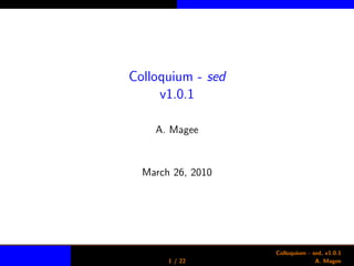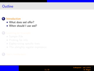 The document is a presentation on the stream editor sed. It introduces sed and explains what it can do, such as operating on specific lines and making text manipulations quickly. The bulk of the document provides examples of using sed commands like printing, deleting, and replacing lines and text with regular expressions. It also notes some of sed's limitations, such as its inability to handle multi-line matches or perform arithmetic.