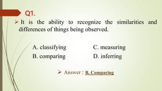 This document contains 46 multiple choice questions about science education. It covers topics like scientific processes, teaching methods, learning theories, classroom management, and assessment. The questions are part of a comprehensive exam review for a science teaching methods course. Each question is followed by several answer choices and the identified correct answer.