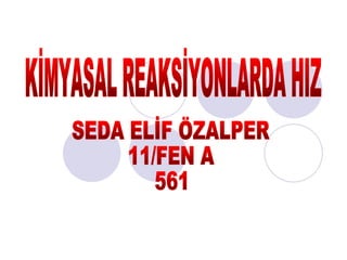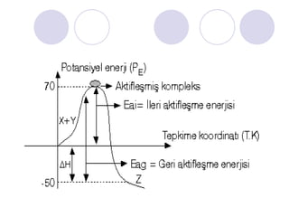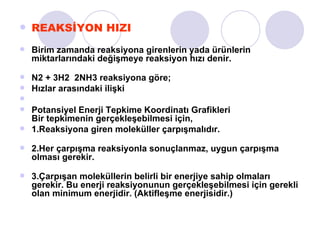 REAKSİYON HIZI Birimzamanda reaksiyona girenlerin yada ürünlerin miktarlarındaki değişmeye reaksiyon hızı denir. N2 + 3H2 2NH3 reaksiyona göre; Hızlar arasındaki ilişki Potansiyel Enerji Tepkime Koordinatı Grafikleri Bir tepkimenin gerçekleşebilmesi için, 1.Reaksiyona giren moleküller çarpışmalıdır. 2.Her çarpışma reaksiyonla sonuçlanmaz, uygun çarpışma olması gerekir. 3.Çarpışan moleküllerin belirli bir enerjiye sahip olmaları gerekir. Bu enerji reaksiyonunun gerçekleşebilmesi için gerekli olan minimum enerjidir. (Aktifleşme enerjisidir.)
