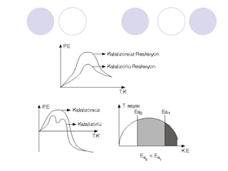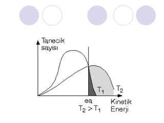 4.Aktifleşmiş kompleks sayısıartar. 5.k sabiti büyür. Not : Sıcaklığın değişmesi ile aktifleşme enerjisinin değeri değişmez. Bir tepkimenin farklı iki sıcaklıktaki tanecik sayısı kinetik enerji dağılım grafiği şekildeki gibidir.