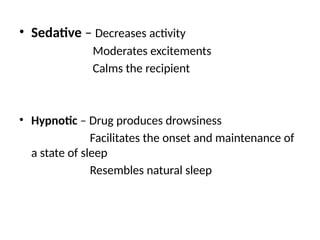 The document discusses sedative and hypnotic drugs, detailing their effects on the central nervous system and their classifications, including barbiturates and benzodiazepines. It outlines mechanisms of action, pharmacological properties, and their impact on sleep stages, as well as therapeutic uses and pharmacokinetics. Additionally, it highlights other medications affecting sleep and their various effects, emphasizing the significance of these drugs in treating conditions like anxiety and sleep disorders.