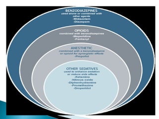This document discusses benzodiazepines (BDZs), including their discovery, mechanism of action, effects, and examples like diazepam and midazolam. It notes that BDZs bind to GABA receptors in the brain to have sedative, anxiolytic, hypnotic, amnestic, and anticonvulsant effects. Their onset and duration of action depends on lipid solubility. While generally safe, they can cause respiratory depression, especially in high doses or with pre-existing lung conditions. Their effects are reversed by the antagonist flumazenil. Midazolam is water-soluble and shorter-acting than diazepam. It is metabolized in the liver