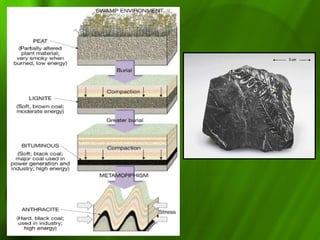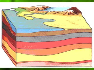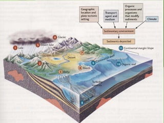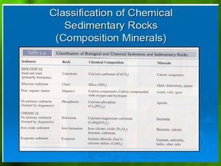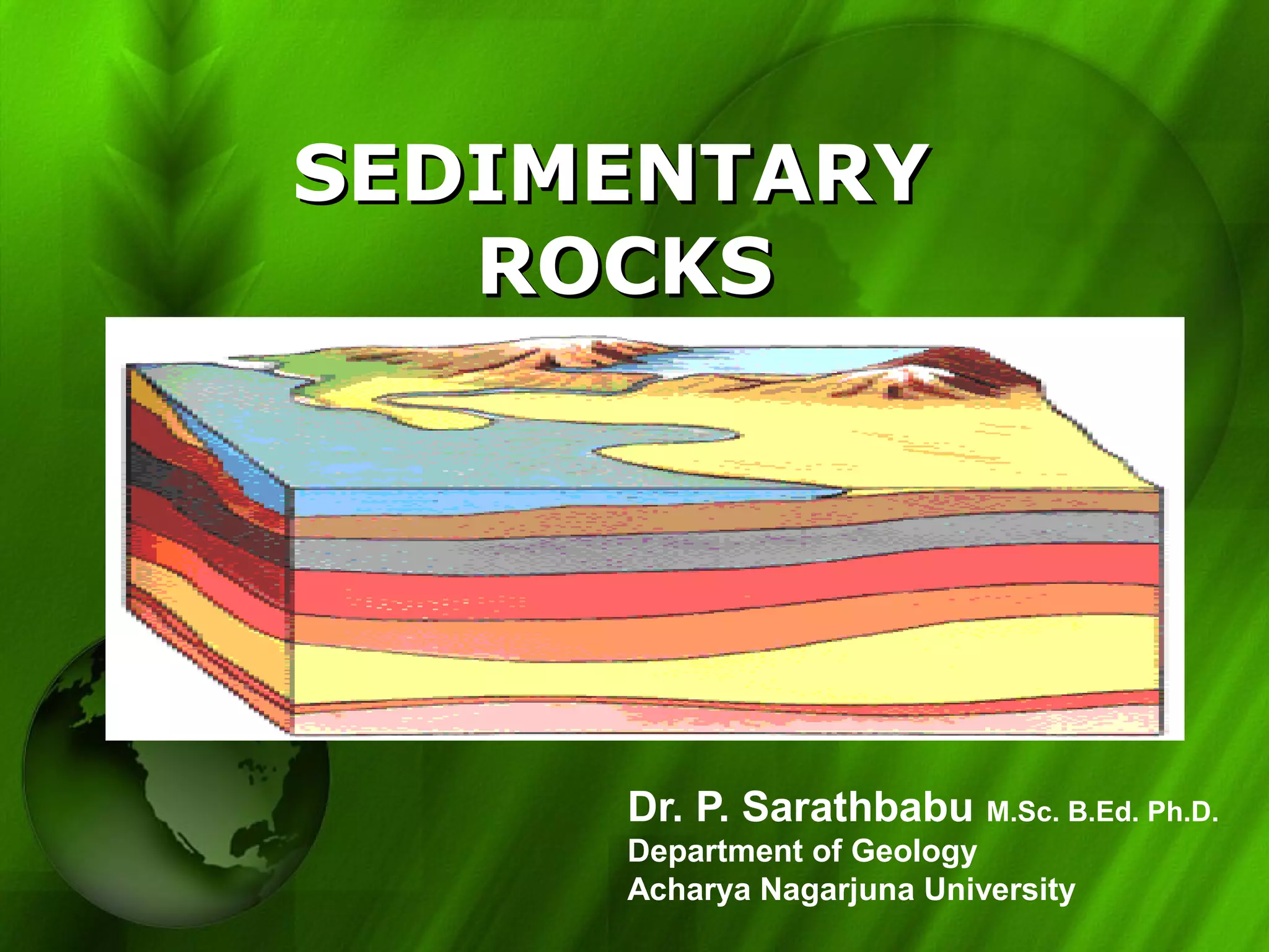 Sedimentary rocks form from the compaction and cementation of sediments such as sand, mud, and minerals. There are two main types - clastic rocks which form from solid particle sediments, and chemical rocks which form from mineral precipitation. Common sedimentary rocks include conglomerate, sandstone, limestone, shale, and laterite. Sedimentary structures within the rocks like ripple marks, cross-bedding, and mudcracks provide clues about the depositional environment.