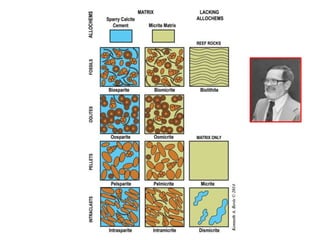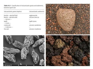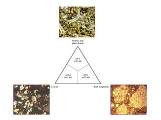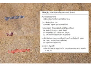 This document provides a detailed classification system for sedimentary rocks. It divides sedimentary rocks into siliciclastic rocks such as rudites, arenites and lutites. It also covers biogenic/biochemical rocks like carbonates and organic deposits, as well as chemical rocks including evaporites and iron deposits. Volcaniclastic rocks derived from volcanic eruptions are also discussed. Each category contains numerous subdivisions based on composition, texture and depositional environment. Examples are given throughout to illustrate different rock types.