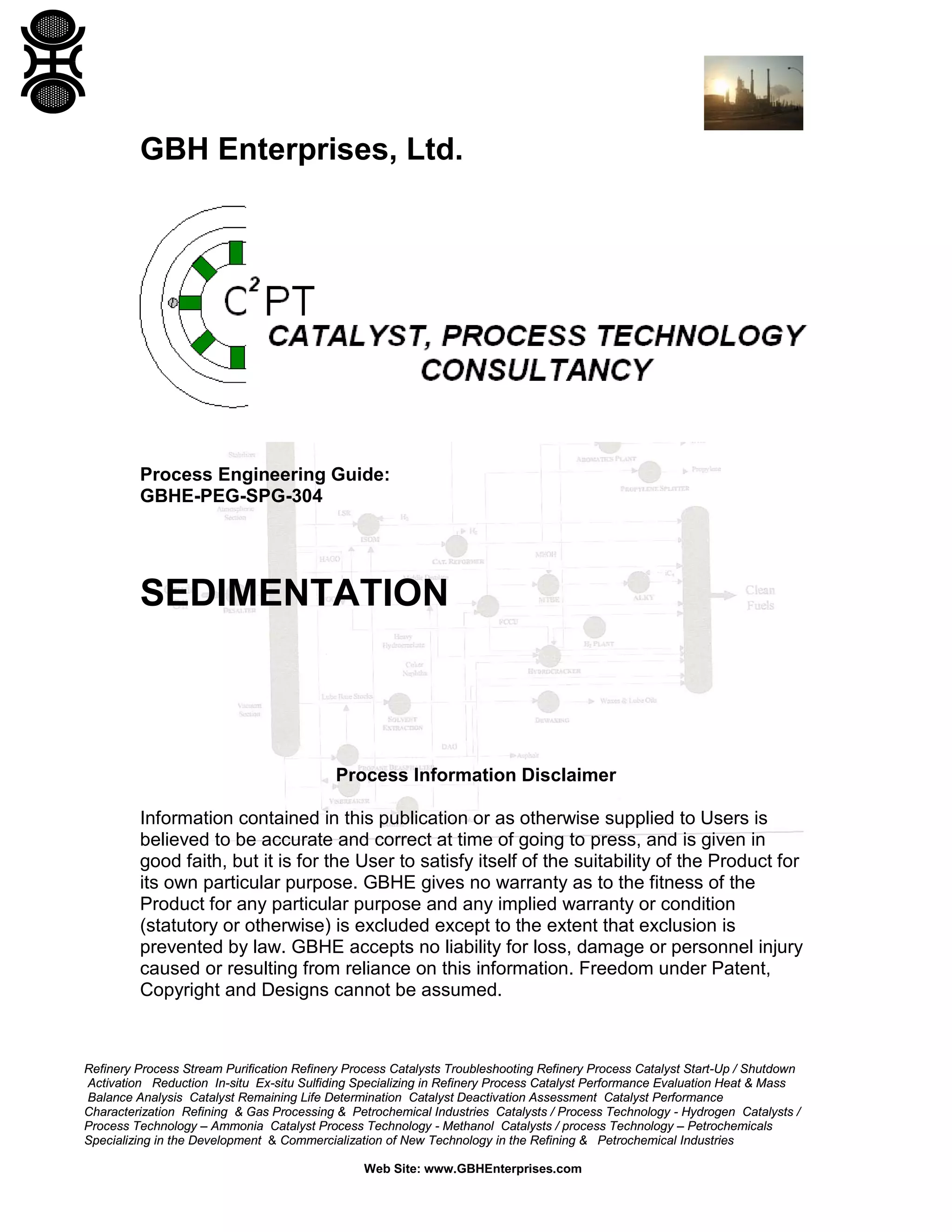 The document is a process engineering guide from GBH Enterprises detailing sedimentation as a key technique for solids/liquids separation in refinery and petrochemical industries. It discusses the importance of sedimentation, various settling regimes, and the underlying science, including factors affecting sedimentation rates and methodologies for improvement. Additionally, it emphasizes GBH's focus on catalyst performance and the development of new technology in these sectors.