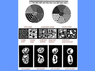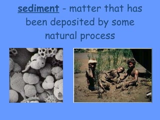 There are several types of sediments found in oceans. Terrigenous sediments are derived from land sources through rivers, glaciers, wind, and coastal erosion. Biogenous sediments are derived from plants and animals, consisting mainly of shells and bones. They form oozes, including calcareous oozes made of calcium carbonate from organisms like foraminifera and coccolithophores, and siliceous oozes made of silicon from diatoms and radiolaria. Hydrogenous sediments form through chemical reactions in the ocean and include manganese nodules, phosphorites, and deposits near hydrothermal vents. Sediment size, sorting, and location affect conditions for organisms.