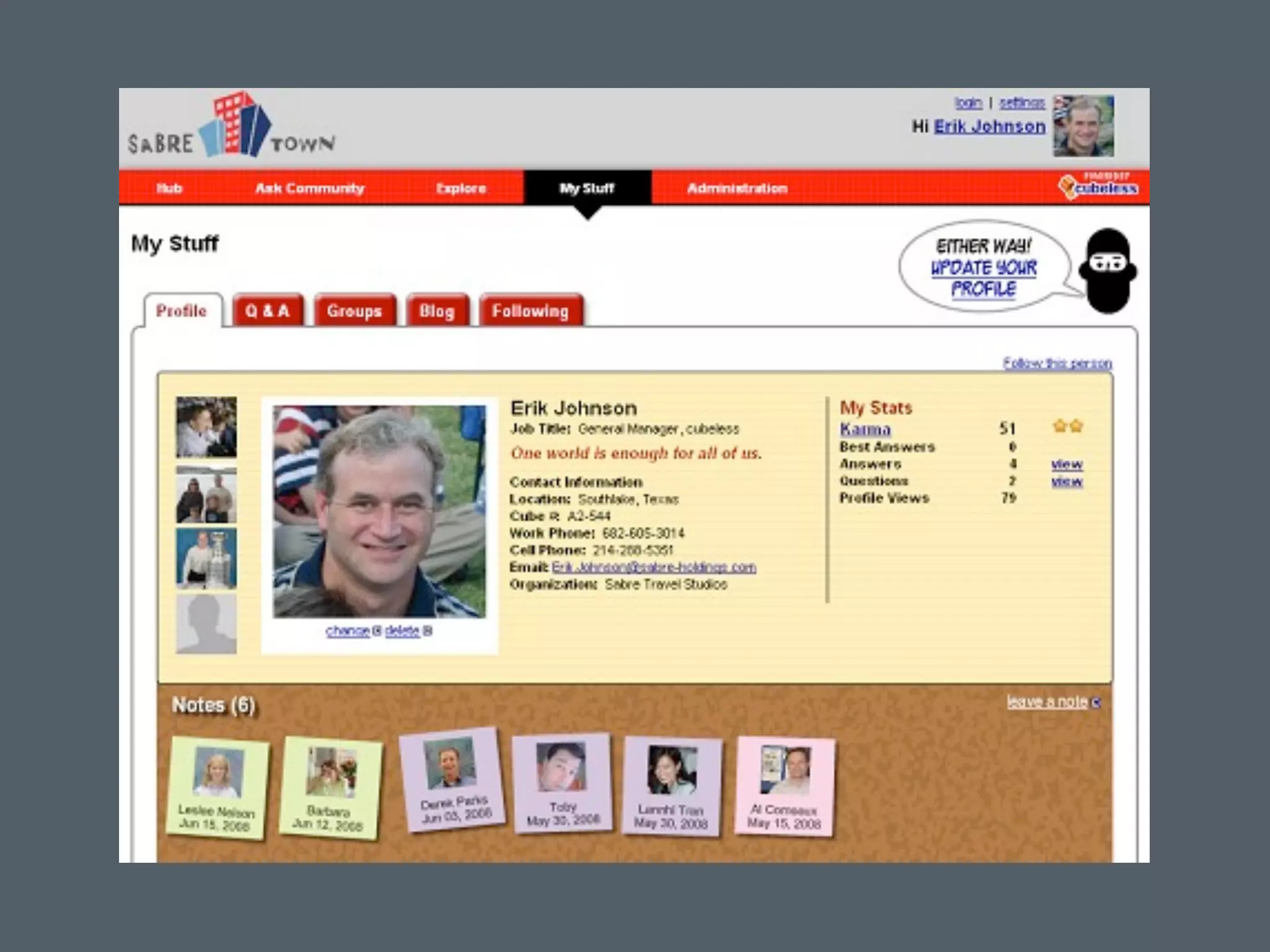 60% - 70%of Sabre employees actively use the system each month 60% of questions asked are answered within one hour of posting (90% in 24 hours) Average of 30 page views per employee user visit Each question posted to the community receives an average of nine answers