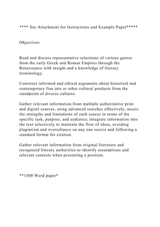 The document outlines objectives for reading and discussing literature from early Greek and Roman empires through the Renaissance, emphasizing the use of literary terminology. It also highlights the need to construct informed arguments about fine arts and cultural products from diverse perspectives, while effectively gathering and assessing information from various sources. Lastly, it instructs on maintaining the flow of ideas in writing and proper citation practices for a 1500-word paper.