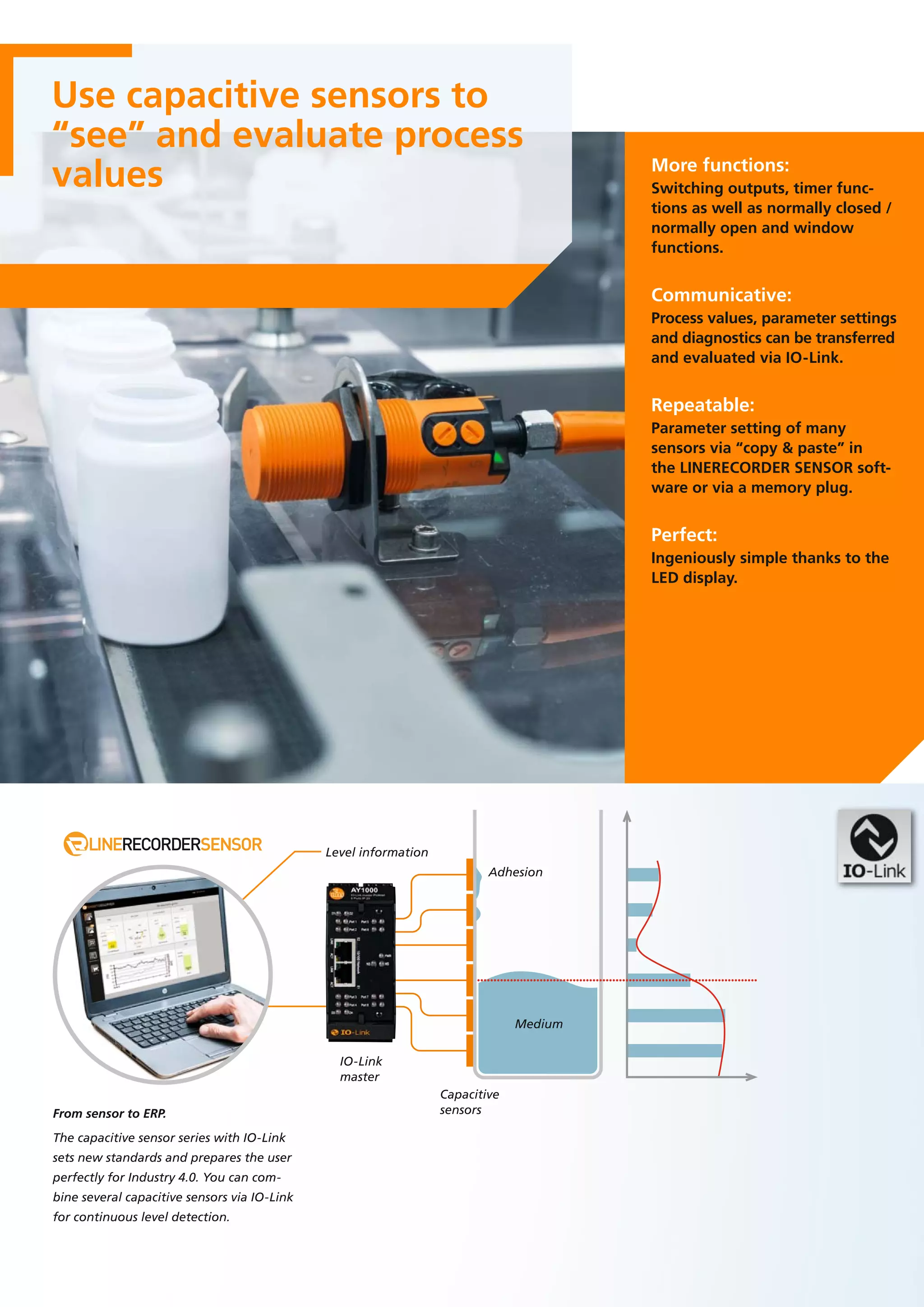 The document summarizes a new capacitive sensor series from ifm that uses IO-Link technology. The sensors can continuously detect liquid levels and transmit process values, parameter settings, and diagnostics via IO-Link. They are distinguished by high protection ratings, temperature resistance up to 110°C, and high EMC resistance. An LED display allows users to easily see and adjust the switch point for their application.