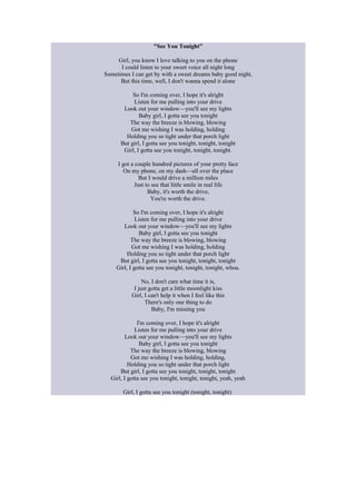 The song is about a man who is driving to see his girlfriend late at night because he misses her and wants to hold her. He has many pictures of her face but wants to see her smile in person. Though it is late, he does not care what time it is and just needs to kiss her under the porch light because there is only one thing he needs to do which is see her since he is missing her.