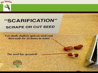 Seed dormancy is the state where seeds fail to germinate under favorable conditions, which conserves energy and minimizes metabolic activity. It can be categorized into types such as imposed dormancy due to environmental conditions and innate dormancy due to internal factors. Various methods, including scarification and stratification, can be used to overcome dormancy, allowing seeds to germinate under appropriate conditions.