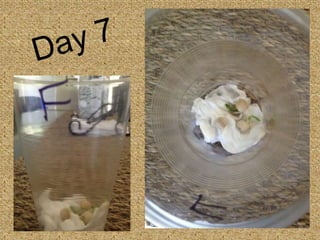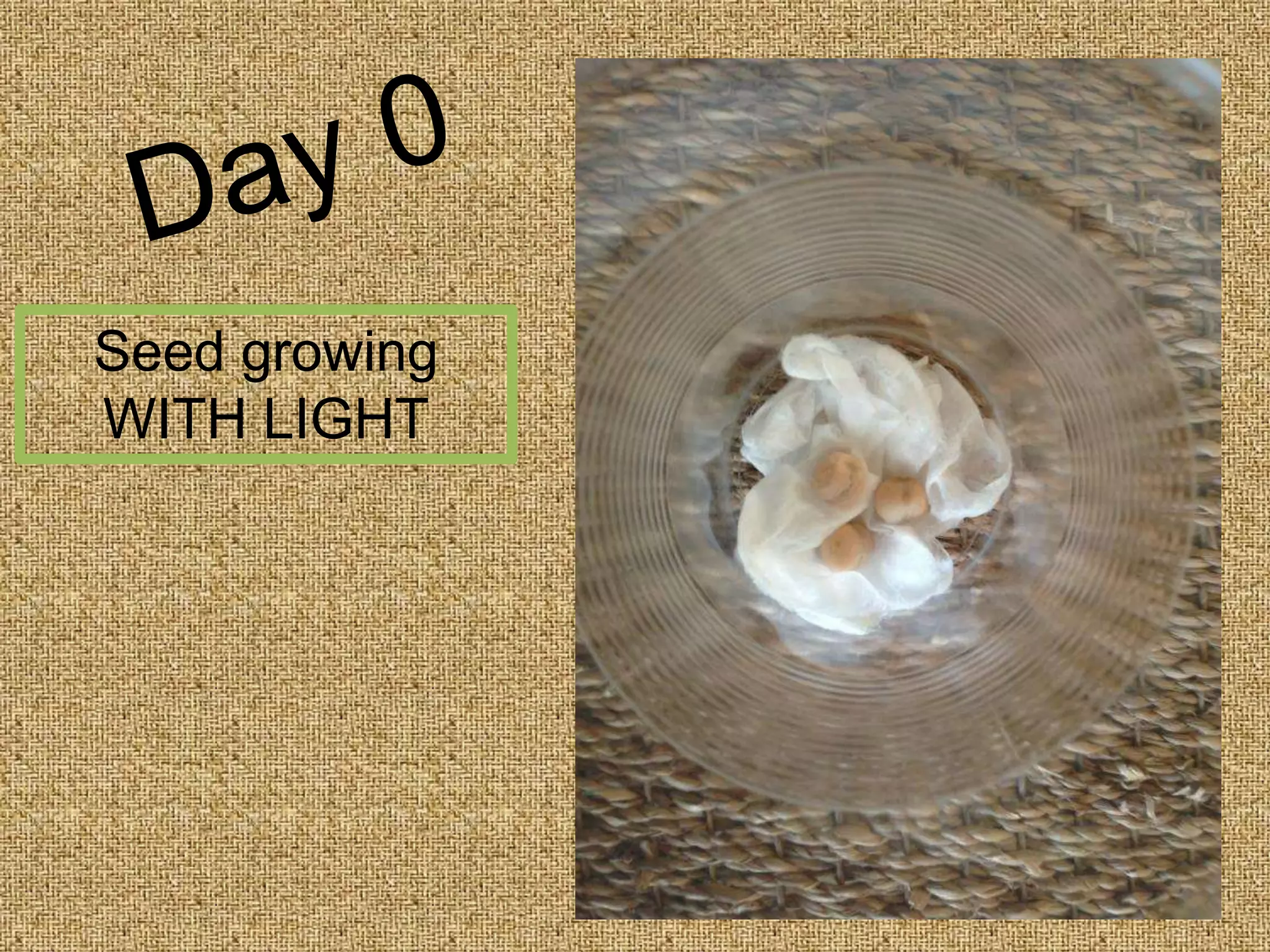 A photo sequence shows a seed growing with and without light. The seed growing with light sprouts and develops leaves, while the seed growing without light does not sprout or grow at all. Proper light is necessary for seed germination and plant growth.