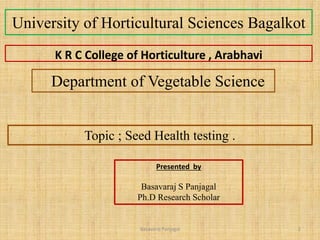 The document discusses various methods for seed health testing. It describes germination tests including the top-paper, between-paper, sand, and agar methods. Other tests discussed are the washing test, incubation methods using blotters or agar plates, seedling symptom tests, test tube agar methods, and grow-on tests. Objectives of seed health testing are to identify quality problems, determine planting value, and check for diseases. Specific methods covered in detail include the washing test, incubation methods, seedling symptom test, and test tube agar method.