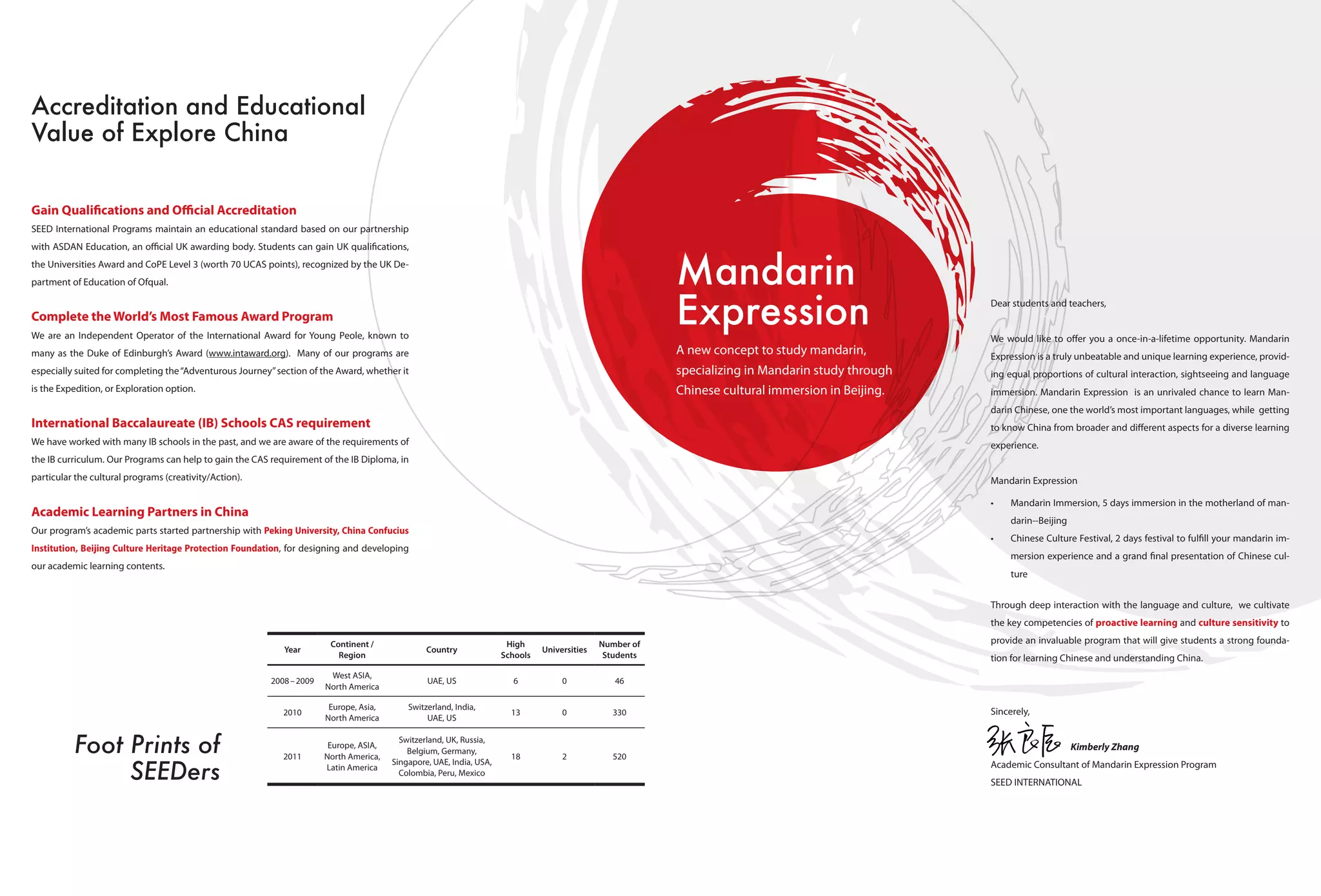 The document details the educational programs offered by Seed International, focusing on Mandarin immersion and cultural experiences in China. Students can gain recognized UK qualifications and participate in the Duke of Edinburgh’s Award through unique learning experiences that combine language study with cultural interactions. Programs are linked to established academic partners, providing a comprehensive foundation for understanding Chinese language and culture.