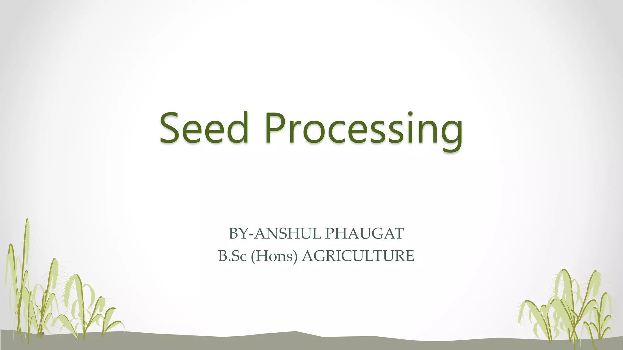Seed processing is a vital part of ensuring high quality seed for end users. It includes cleaning, drying, treatment, packaging, and storage. The goals of seed processing are to reduce bulk, increase longevity by drying to a safe moisture level and treating with protectants, reduce variability in vigor, and improve uniformity in size and shape. The sequence of operations typically includes drying, receiving, pre-cleaning, conditioning, cleaning, separating, treating, weighing, bagging, and storage or shipping. Processing aims to separate inert materials and weed seeds from the seed lot while upgrading quality by eliminating damaged or low vigor seeds to obtain a high percentage of pure seed with maximum germination potential.