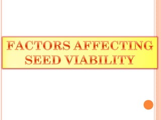 Seed viability refers to a seed's ability to germinate and is affected by various conditions. Viability is highest at physiological maturity and then declines over time, with lifespan varying greatly between species. Conditions like cold, dry storage help maximize longevity. Factors like mechanical damage, incomplete pollination, weathering, moisture content, temperature, and fungi can all negatively impact viability during development and storage. Proper drying and storage at low moisture levels and temperatures can extend viability significantly.