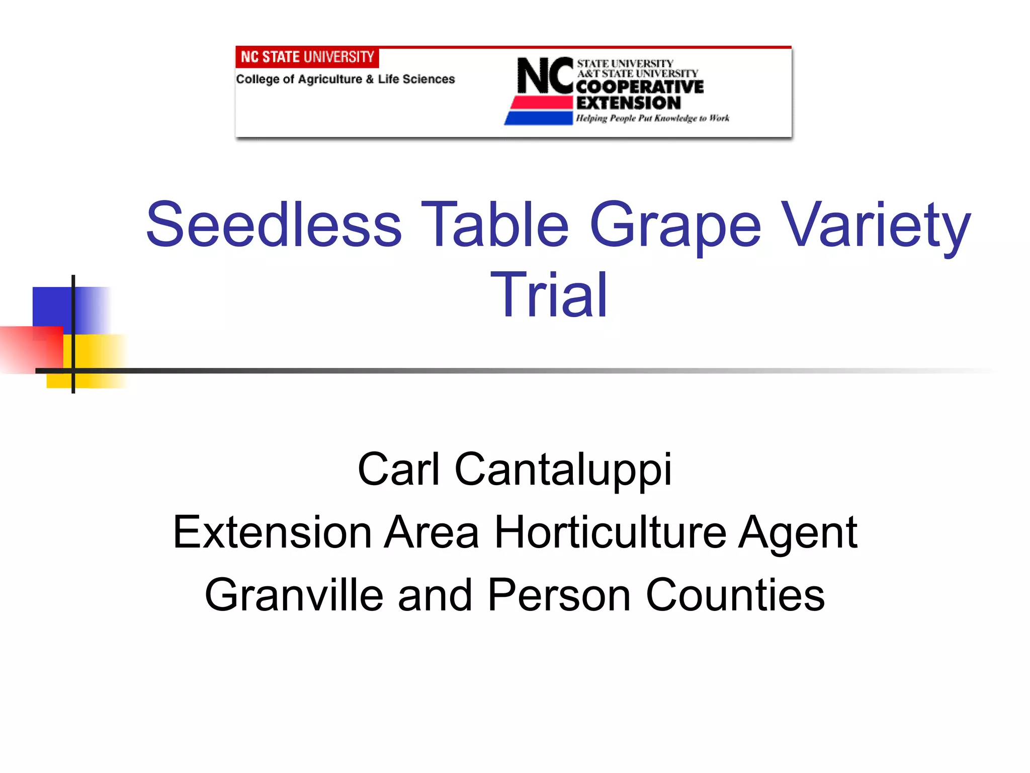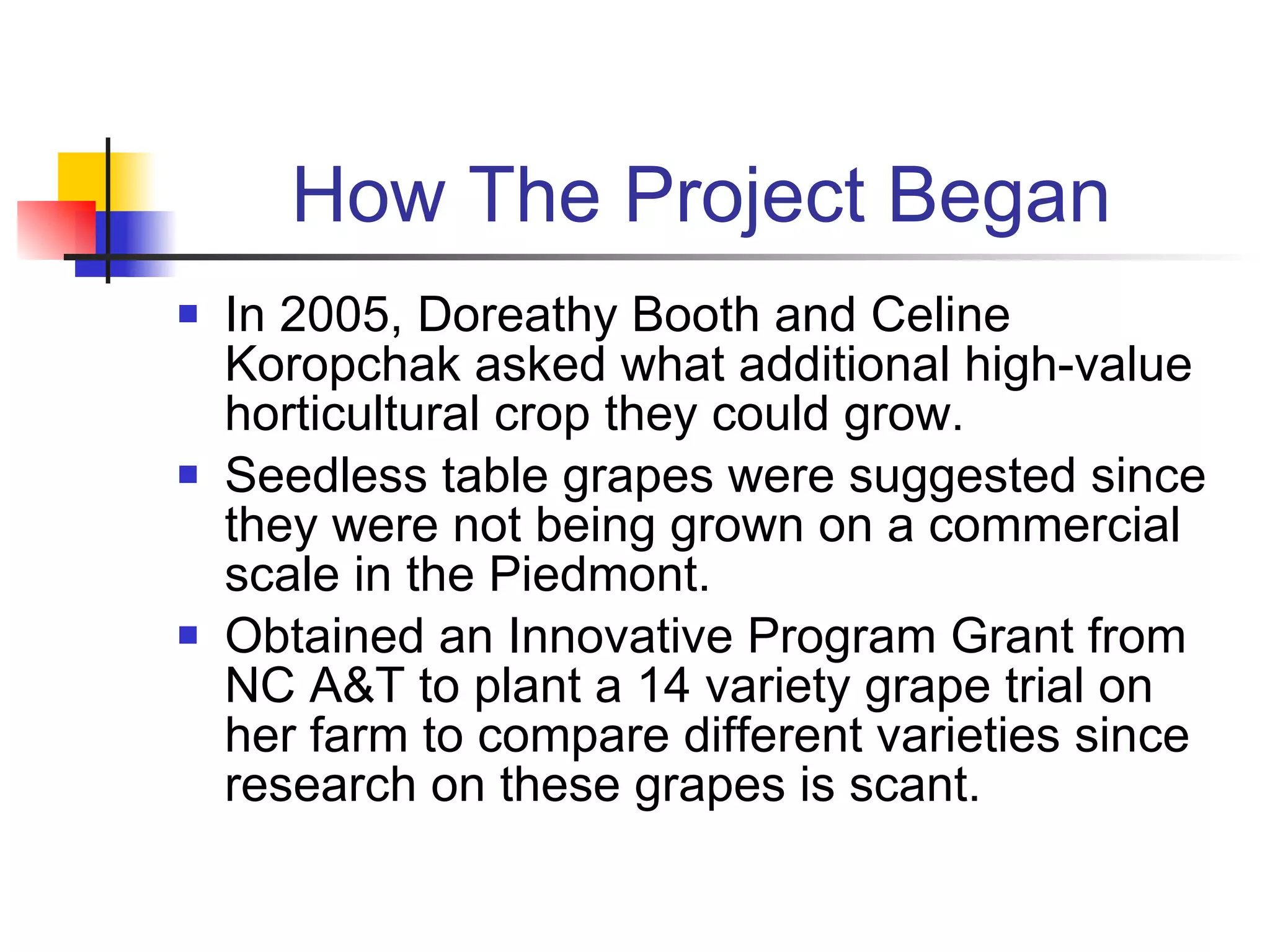 The document summarizes a seedless grape variety trial conducted between 2005 and 2010 on a farm in North Carolina. Fourteen varieties of seedless table grapes were planted and evaluated based on yield and harvest date. The top yielding varieties were Mars, Marquis, and Venus. Initial costs to establish the vineyard totaled over $25,000.