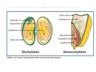 A seed contains a seed coat, endosperm or cotyledon that stores food, and an embryo containing a cotyledon, epicotyl, hypocotyl and radicle. Seeds are dispersed by various means, including wind using wings, hairs or being light, as well as animals through hooks or barbs, or water through air spaces or floats.