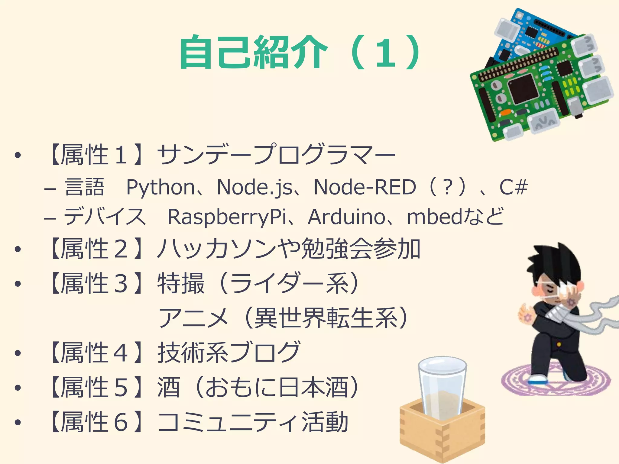 Python、Node.js、Node-RED(?)、C# – デバイス RaspberryPi、Arduino、mbedなど • 【属性2】ハッカソンや勉強会参加 • 【属性3】特撮(ライダー系) アニメ(異世界転生系) • 【属性4】技術系ブログ • 【属性5】酒(おもに日本酒) • 【属性6】コミュニティ活動