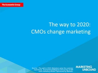 The document summarizes a survey of 499 chief marketing officers (CMOs) by the Economist Intelligence Unit, highlighting that by 2020, a significant majority of CMOs anticipate that marketing departments will wield substantial influence over business strategy and technology. It emphasizes the shift from traditional advertising to a focus on customer experience, with many marketers believing they will control the end-to-end customer experience. The report underscores the necessity for marketers to adapt to rapidly advancing technology and changing customer expectations.