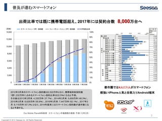 出荷比率では既に携帯電話超え、2017年には契約台数 8,000万台へ 都市圏では4人に1人がスマートフォン 2012年3月末のスマートフォン契約数は2,522万件となり、携帯端末総契約数 根強いiPhone人気と全部入りAndroid端末 1億1,232万件に占めるスマートフォン契約比率は22.5%になると予測。 その後は2013年3月末:4,335万件(37.7%)、2014年3月末:5,659万件(48.3%)、 2015年3月末:6,629万件(55.8%)、2016年3月末:7,447万件(62.1%)、2017年3 月:8,119万件(67.3%)となり、2014年度末にはスマートフォン契約数が過半数にな ると予測する。 Our Mobile PlanetMM総研 スマートフォン市場規模の推移・予測(12年3月) 2 Copyright © 2012 Seesaa Inc. All Rights Reserved.
