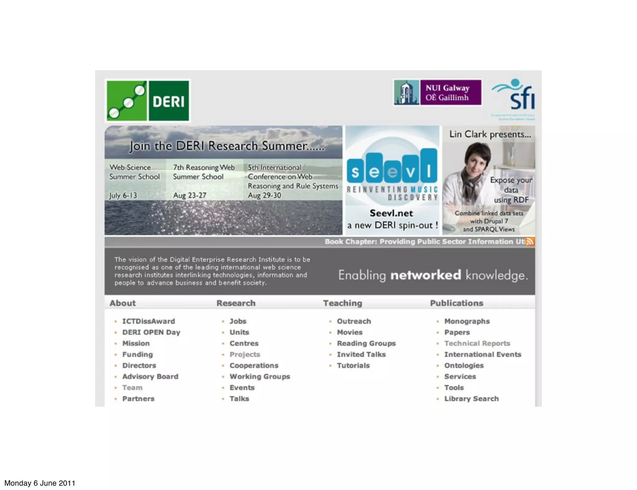 Dr. Alexandre Passant gave a lightning talk at SemTech2011 in San Francisco on June 6th 2011 about Seevl, a system he created that uses semantic web technologies to provide unique ways of exploring music and connections between artists. Seevl interlinks music data using RDF, ontologies like FOAF and SKOS, stores the data in a graph database, and generates recommendations and search results through SPARQL queries. The system aims to help users find new artists, understand relationships between bands, and explore their cultural and musical universe by going beyond just sounds.