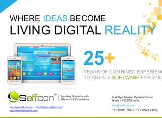 Seffcon is a software development company based in India that has over 25 years of combined experience helping clients build customized software solutions. They provide services like website development, mobile app development, and automation of business processes. Some of their portfolio includes an online exam preparation tool, a customer relationship management system, and a file management system for allocating and tracking files. They emphasize rapid development and user-centric design to help clients launch digital products and services quickly.