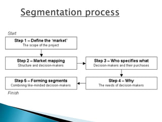 This document discusses market segmentation. It defines market segmentation as dividing a large homogeneous market into identifiable segments with similar needs, wants, or demands. It identifies four types of market segmentation: geographic, demographic, sociographic, and psychographic. The document notes that market segmentation allows companies to target specific customer categories more effectively and efficiently, and to divide marketing workload.