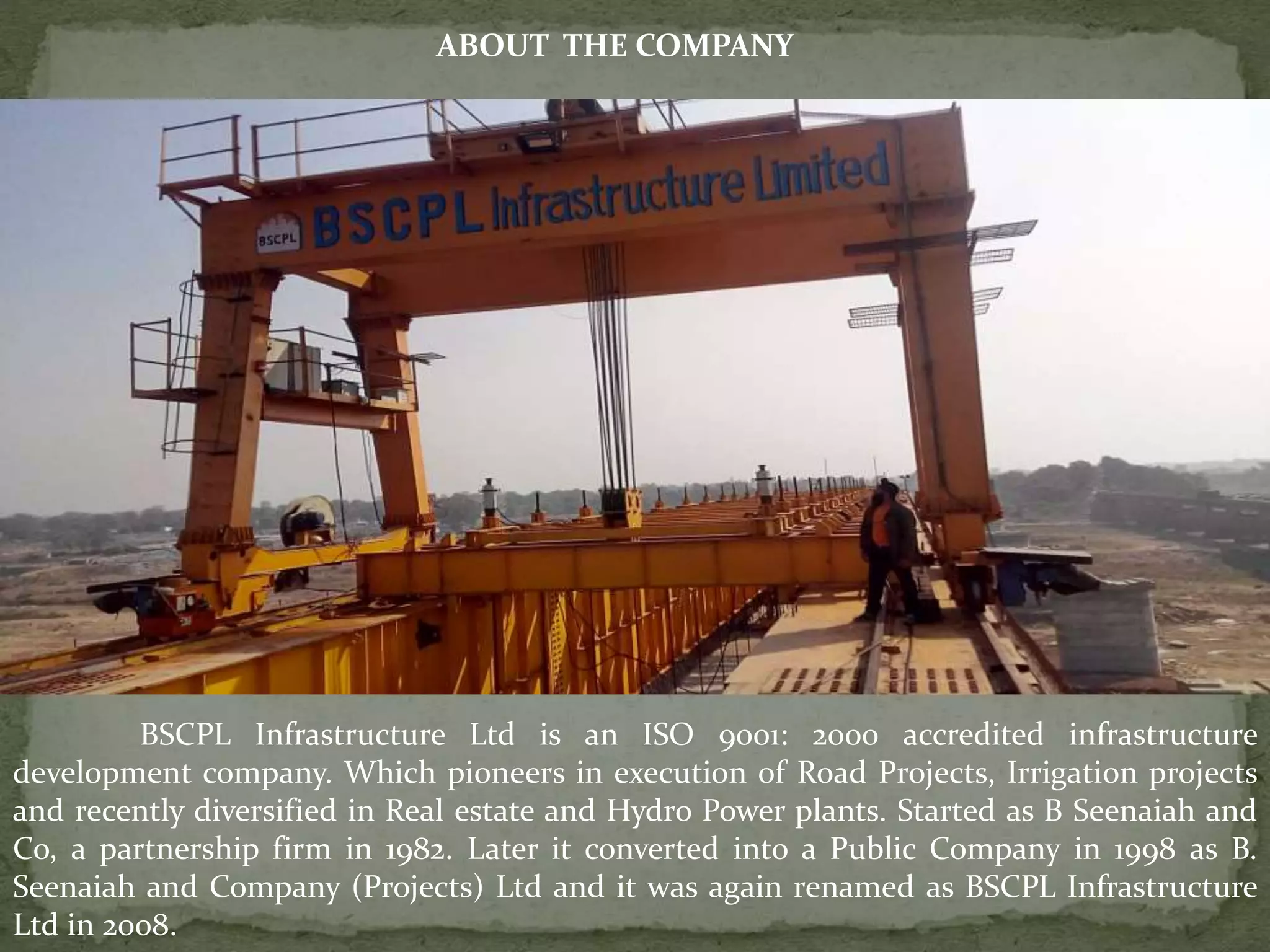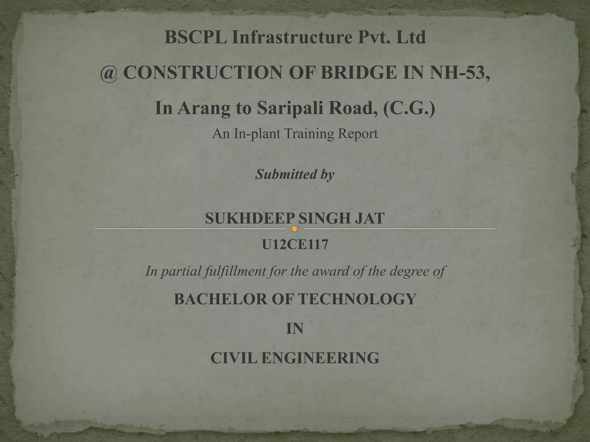 BSCPL Infrastructure Pvt. Ltd is constructing a four-lane bridge over the Mahanadi River in Chhattisgarh, India as part of a contract to reconstruct 250 km of National Highway 53. The segmental bridge is being built using the lanuching girder method, where precast concrete segments are placed using a launching girder and temporary supports. Segments are dry fitted, glued with epoxy, post-tensioned with 7-ply cable strands using hydraulic jacks, then grouted to form each span. Precast segments are lifted into place by the launching girder's gantry and secured to sliding supports. The launching girder is then advanced to the next pier to begin constructing