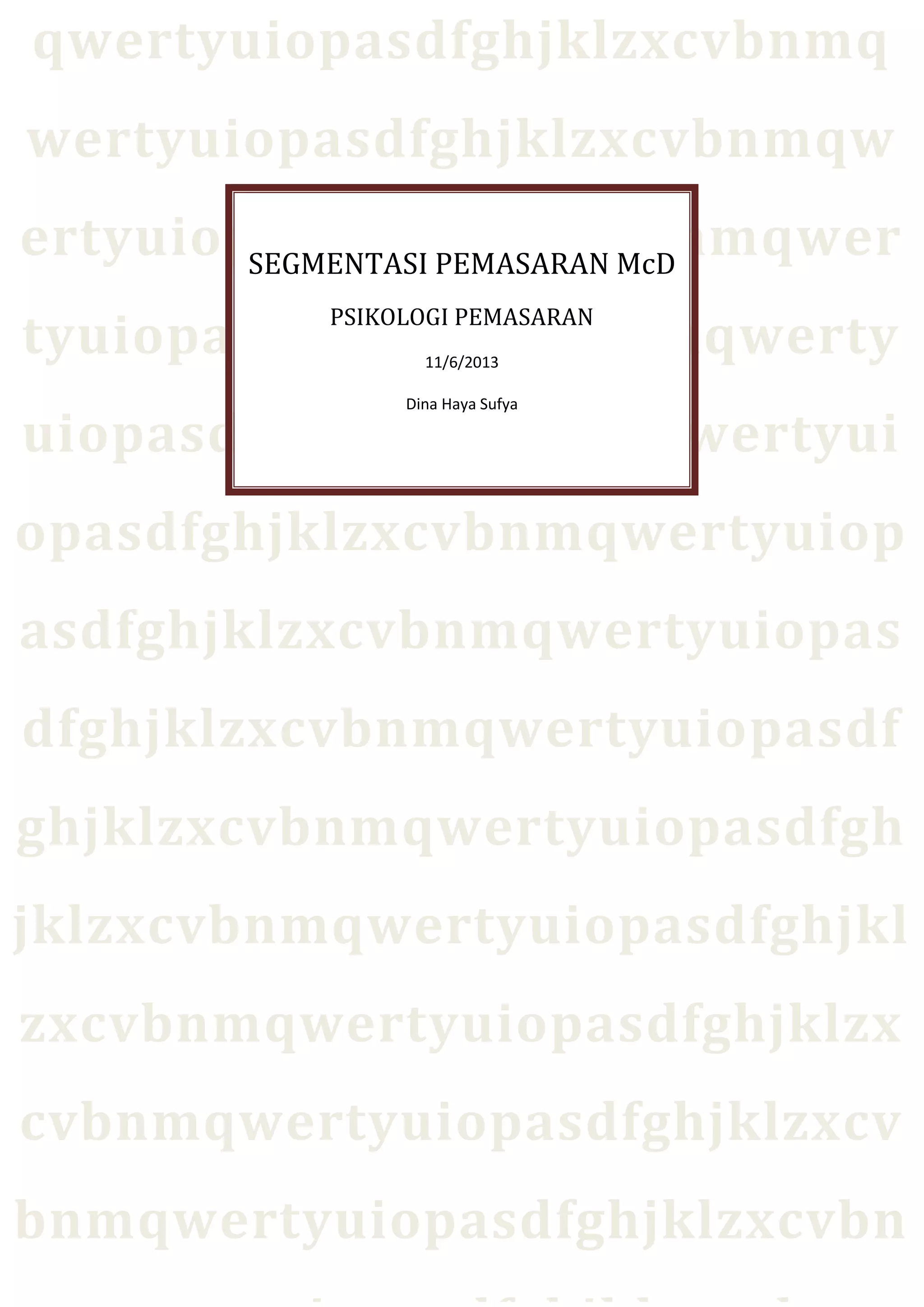 Dokumen ini membahas segmentasi pemasaran McDonald's, termasuk segmentasi geografis, demografis, dan psikologis yang ditujukan untuk menjangkau berbagai kalangan, termasuk masyarakat pedesaan dan kelas menengah ke bawah. McDonald's berencana untuk menghadirkan produk yang lebih sehat dan ramah lingkungan, mengadaptasi menu tradisional dan lokal. Strategi pemasaran dilakukan melalui berbagai media untuk meningkatkan jangkauan dan kesadaran merek di masyarakat.