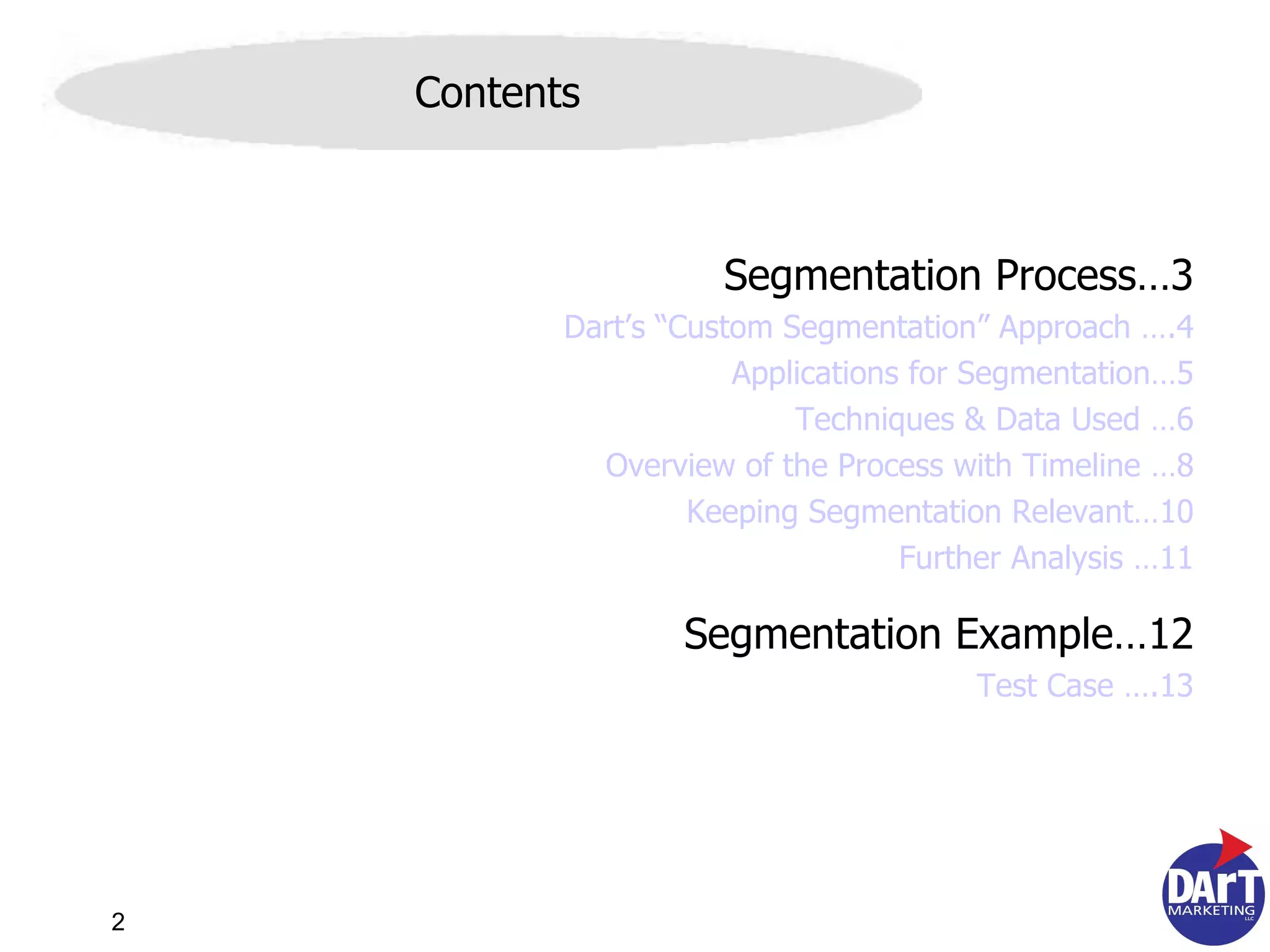 Dart builds sophisticated customer segmentation models using statistical techniques and intuition. The goal is to create distinct customer segments that are predictive of behavior and can be implemented for marketing purposes. Dart analyzes customer, transaction, and demographic data to develop segments. The segmentation process involves data preparation, analysis, model development, and finalizing the segments with descriptive profiles and financial analysis. Segments are monitored over time and recalibrated as needed to keep the segmentation strategy relevant.