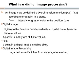 The document discusses digital image processing, focusing on image segmentation techniques such as thresholding, which divides images into meaningful regions for further analysis. It highlights the role of both low-level and high-level processing in understanding and interpreting images, and emphasizes the importance and challenges of accurate segmentation in image analysis tasks. Various segmentation algorithms are outlined, including global and adaptive thresholding methods, along with Otsu’s method for determining optimal thresholds.