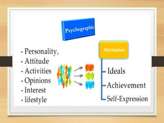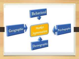 The document discusses market segmentation, which is the process of dividing a heterogeneous market into homogeneous subunits based on various characteristics such as demographics, geography, behavior, and psychographics. It highlights the importance of segmentation for improving customer relations, resource allocation, and competitive analysis. The document also outlines the targeting options available to businesses and the need for effective positioning to create a favorable perception in consumers' minds.