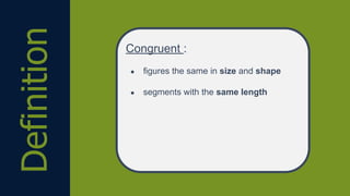 The document provides definitions and examples related to geometry, specifically focusing on concepts like congruence, betweenness of points, midpoints, and distance formulas. It explains that congruent figures have the same size and shape, and outlines how to determine segment lengths and midpoints. Additionally, an example is given involving algebraic expressions to find values related to segments and their midpoints.