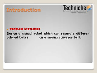 1) The document outlines the rules and specifications for a competition to design a manual robot to separate colored boxes on a moving conveyor belt.