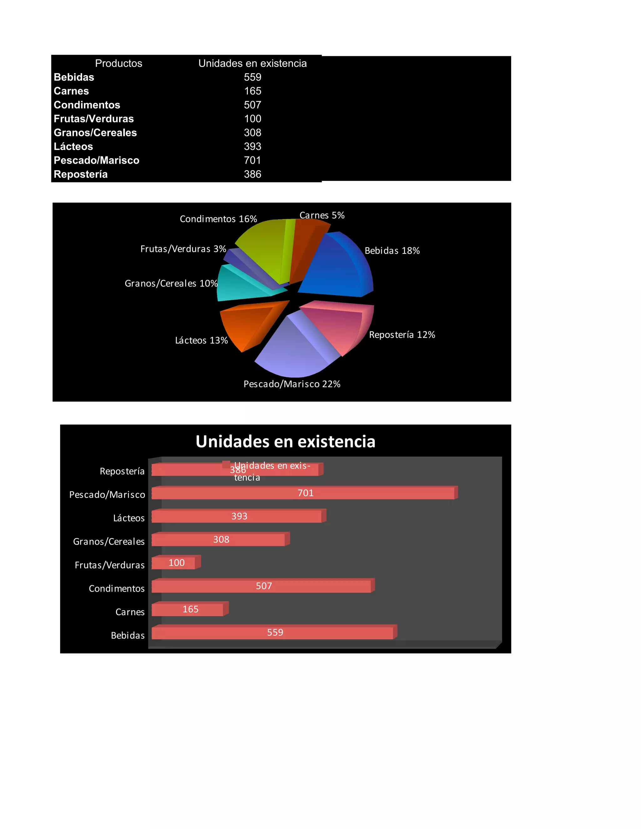 The document contains data on inventory levels of various product categories at a company. Pescado/Marisco (Fish/Seafood) has the highest inventory at 701 units, representing 22% of total inventory. Bebidas (Beverages) has the second highest at 559 units or 18% of total. The categories with the lowest inventories are Frutas/Verduras (Fruits/Vegetables) at 100 units and 3% and Carnes (Meats) at 165 units and 5%.