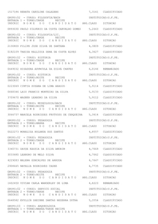 This document contains lists of candidates for various undergraduate courses at the Federal University of Pernambuco (U.F.PE) in Recife. It includes the candidate's registration number, name, average class grade (ARG.CLASS), and situation (CLASSIFICADO = classified, REMANEJADO = reassigned). The courses include administration, accounting, economics, political science, social sciences, law, philosophy, history, museology, pedagogy, social work, archaeology, computer science, biomedical engineering, computing engineering, physics, geology, industrial chemistry, chemistry, and information systems.