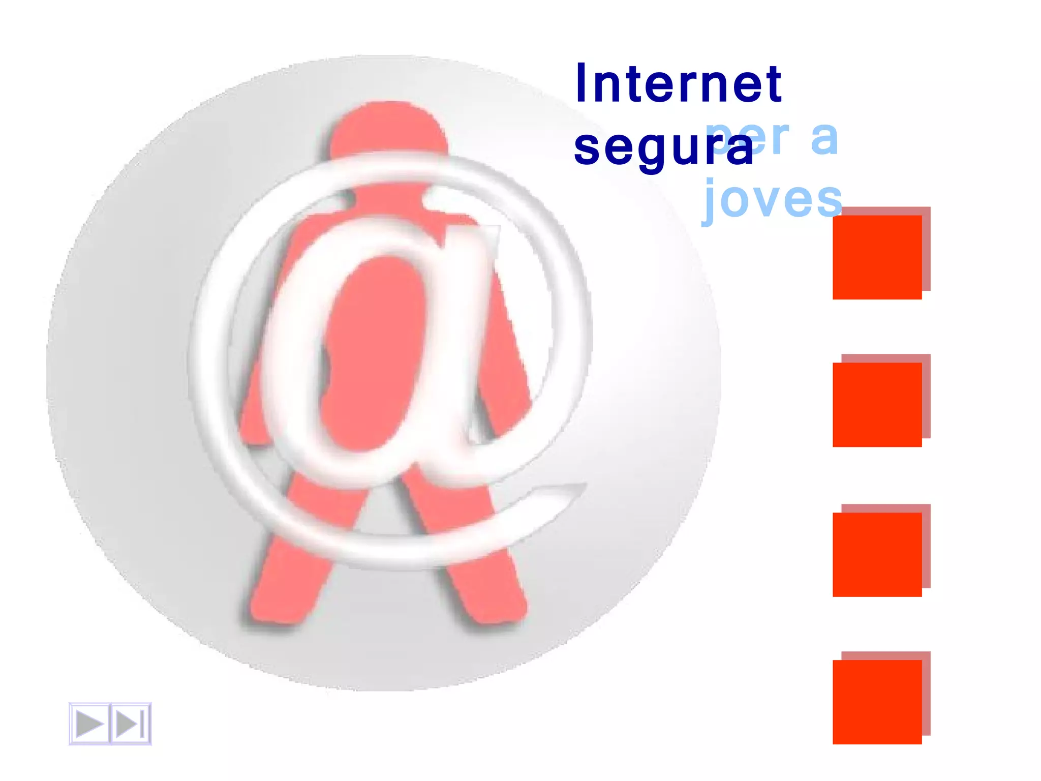 Consells per ainfants i adolescents Quan navegueu o us comuniqueu per Internet, no envieu fotografies si no en coneixeu el destinatari, ni doneu mai les vostres dades . A més, no publiqueu cap dada personal en el vostre bloc que us pugui identificar. Deseu en secret la vostra contrasenya d’accés al correu i no la doneu a ningú. Si feu coneixences noves, expliqueu-ho als vostres pares i també presenteu -los els vostres amics nous . Si voleu conèixer en persona algú que heu conegut per la xarxa, consulteu-ho amb els vostres pares o amb algun adult. Objectius SORTIR Qüestions legals Avantatges i perills Què cal tenir en compte? Consells