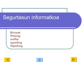 spoofing Spoofing barruannortasunakfaltsutzeko edozein teknika sartzen den arren, ondoren Spoofing mota nagusiak azalduko ditugu: IP spoofing Makina batetik datorren plaketa, baste batetik datorrela pentsatzea datza. Horretarako IP plaketeko igorlearen IP helbidea aldatzen da. ARP spoofing . ARP taula ardezkatuz eginiko nortasun ordezkapena. DNS spoofing .Domeniu izanaren ordezkapena datza. Domeniu-izena eta Ip BIKOTEA ALDATZEN DU.Honetarako DNS zerbitzarako datuak aldatu behar dira. MAIL spoofing Pertsona edo organizazio baten posta elektronikoa ordezkatzea. Web spoofing .Benetako webgune baten ordezkapena ( ez nahastu phising -rekin).