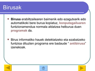 Birusak Birusa erabiltzailearen baimenik edo ezagutxarik edo automatikoki bere burua kopiatuz, konputagailuaren funtzionamendua normala aldatzea helburua duen programak da. Birus informatiko hauek detektatzeko eta ezabatzeko funtzioa dituzten programa ere badaude “ antibirusa ” izenekoak.