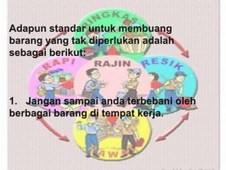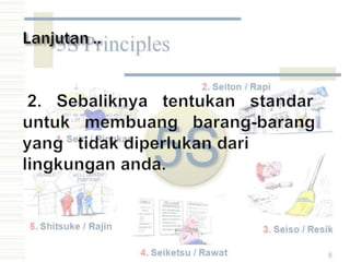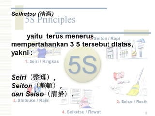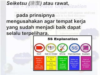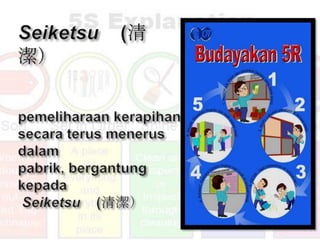 Seiketsu adalah konsep menjaga lingkungan tetap rapi dan bersih serta menjadikannya kebiasaan. Metode penerapannya mencakup tanggung jawab individu terhadap perawatan dan pengelolaan sampah. Konsep ini terkait dengan 5S untuk menciptakan tempat kerja yang efisien dan produktif.
