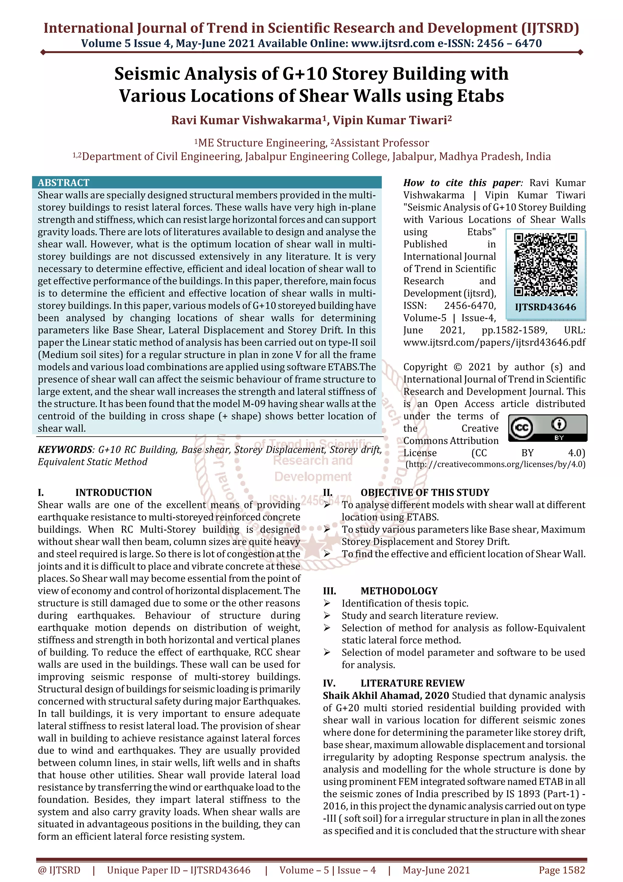 The paper analyzes the seismic performance of a G+10 storey building with various shear wall configurations using ETABS software, focusing on optimal placement for base shear, lateral displacement, and storey drift. It concludes that shear walls significantly improve structural strength and stiffness, with the most effective configuration being a cross-shaped shear wall located at the building's centroid. The study offers insights into enhancing earthquake resistance in multi-storey buildings through strategic shear wall placement.