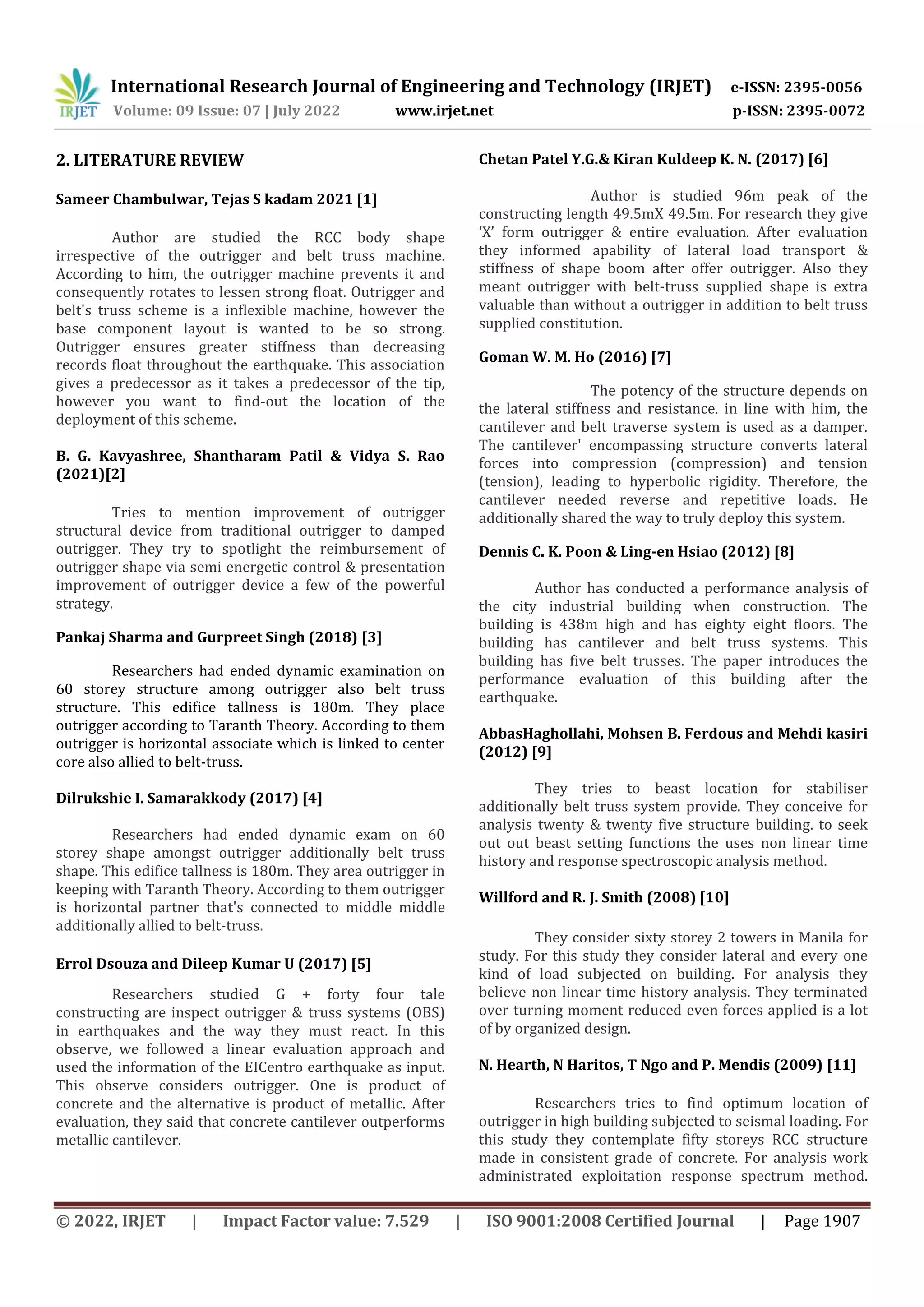 This document discusses the seismic analysis of a high-rise building using outrigger and belt-truss systems. It analyzes a 25-story building considering different floor acceleration ratios under earthquake loads. Response spectrum analysis is performed to determine the building's behavior by examining response parameters like lateral displacement and inter-story drift. Outrigger and belt-truss systems are found to improve the building's stiffness and reduce lateral loads compared to a structure without these systems. The document reviews several other studies analyzing different structural configurations and building heights to determine optimal outrigger locations.