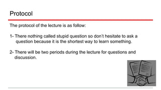 This document provides an overview of the course "Seismic Data Processing" including the protocol, syllabus, references, and importance of seismic data processing. The syllabus covers topics like Fourier transforms, sampling considerations, various processing sequences, acquisition methods, and more. Seismic data processing is important because it helps remove unwanted signals and noise to enhance the signal-to-noise ratio and make seismic reflections clearer.