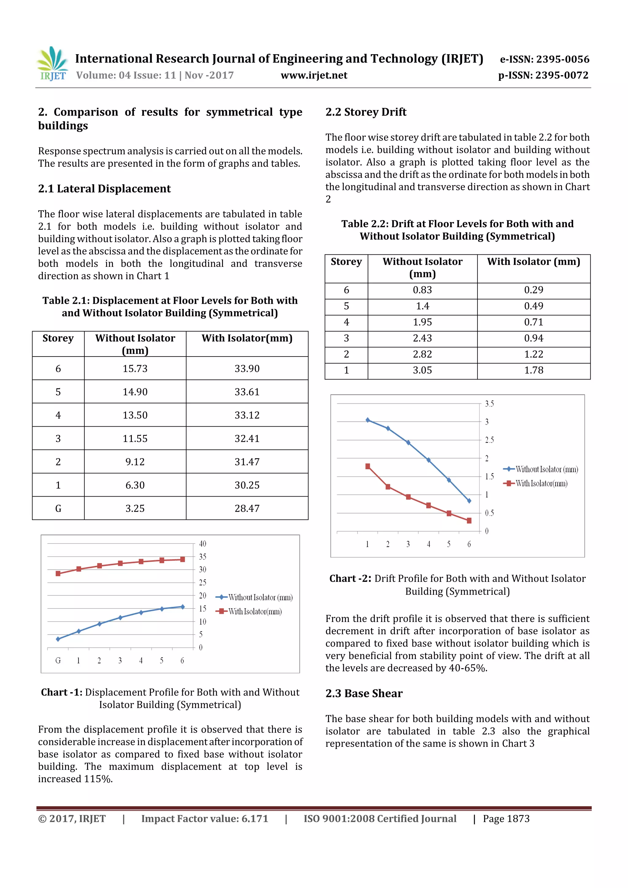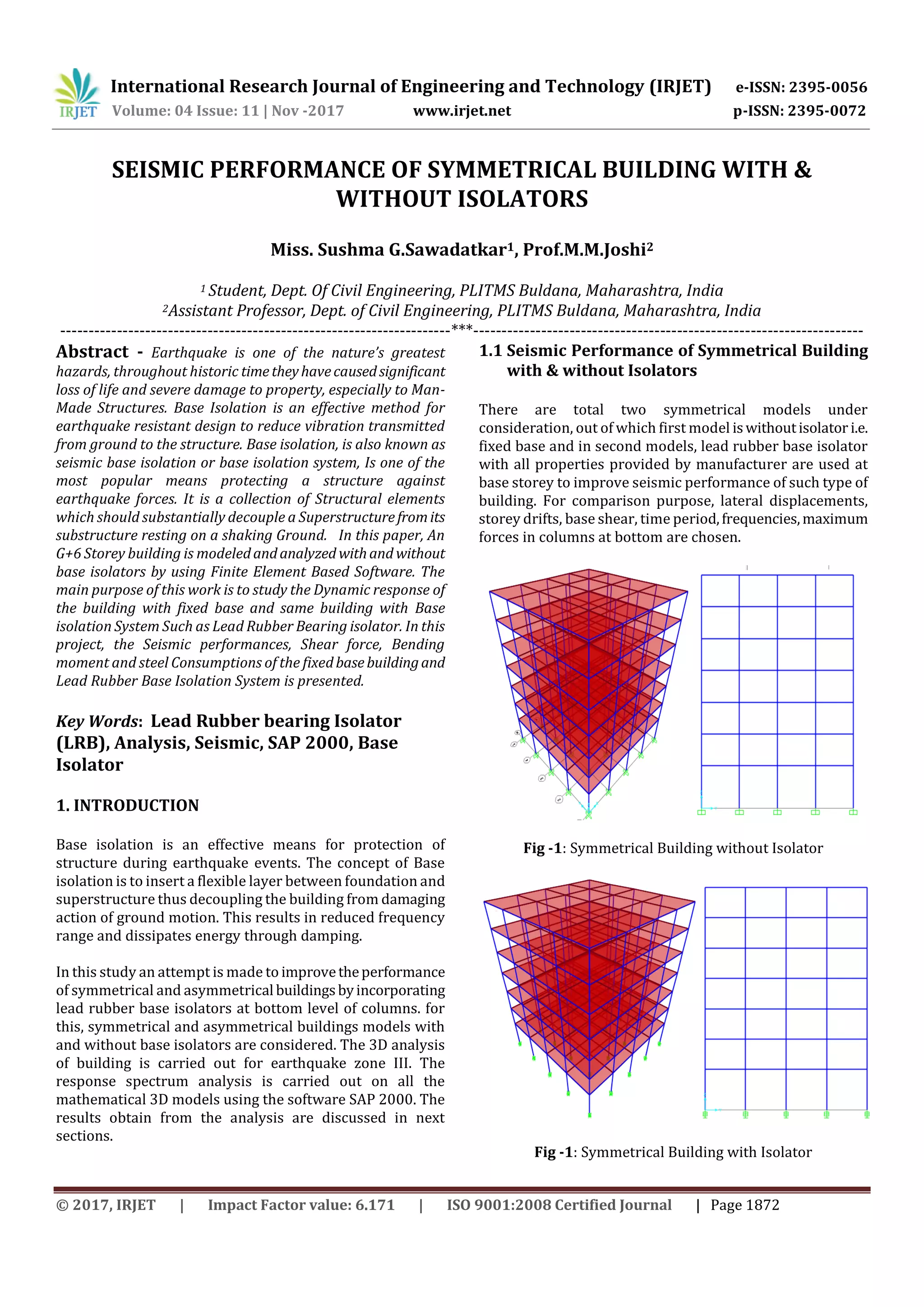 This document analyzes the seismic performance of a symmetrical 6-story building modelled both with and without base isolators. Finite element software is used to model the building and conduct response spectrum analysis. Key findings include: