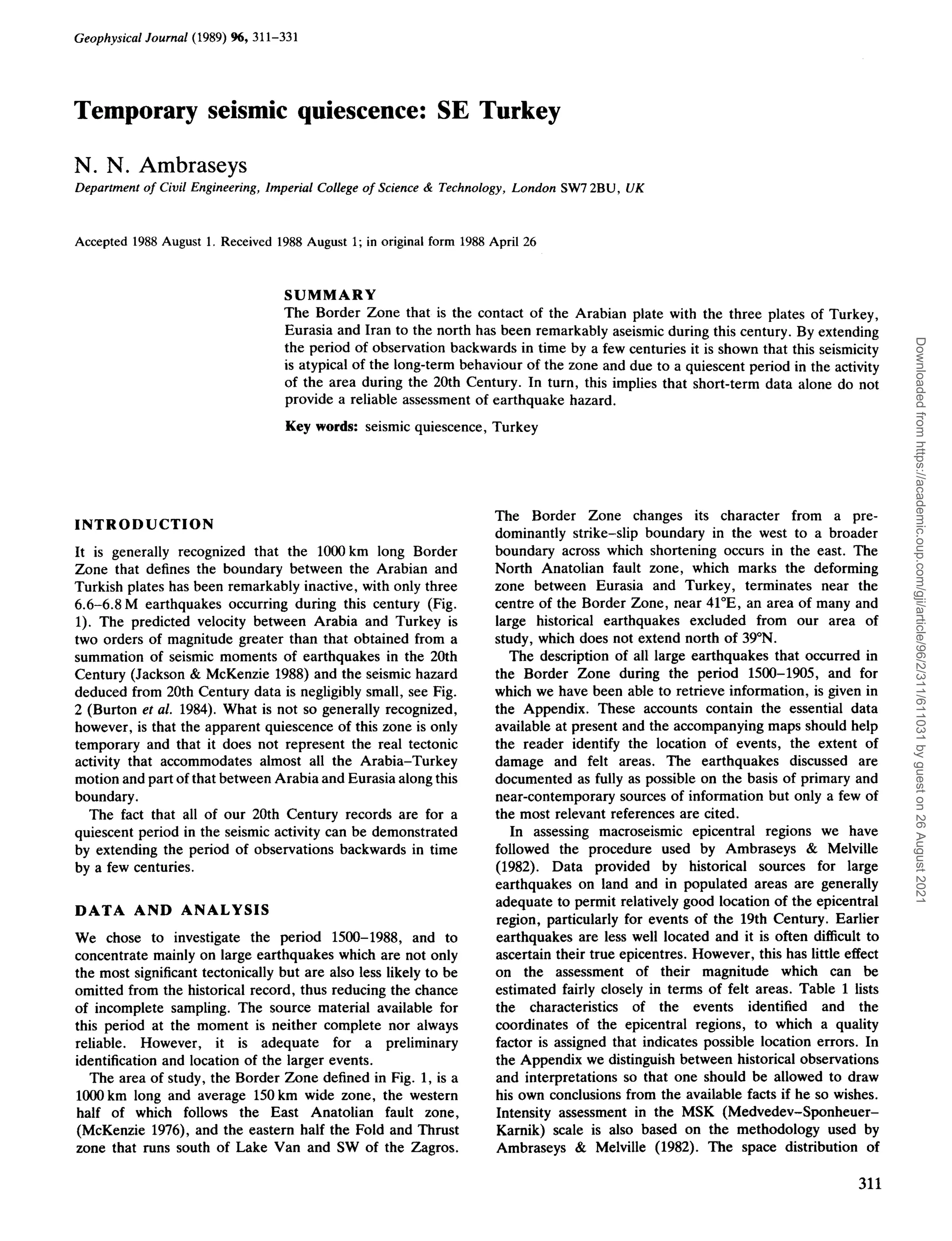 The document examines the seismic quiescence along the border zone between the Arabian Plate and Turkish plates, highlighting a significant lack of seismic activity during the 20th century that is atypical when viewed over several centuries. It asserts that short-term data may not provide a reliable indication of earthquake hazards due to this quiescent period. Historical records show that while there were several large earthquakes in the past, the recent inactivity does not accurately reflect the region's long-term seismic behavior.